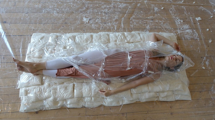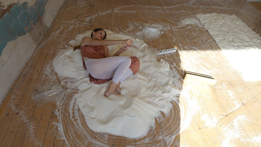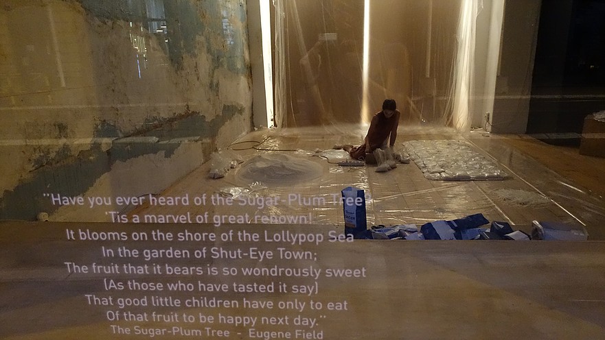 In this performance artist reflects on today’s consumer society, which does not allow, and cannot find comfort beyond physical forms. Sugar is, as important ingredient in society today, the subject of endless controversy and strong symbol of the social order. It’s influence on the changes of human body and mind in recent decades is huge. Sugar transforms the body, thus it transforms the architecture.