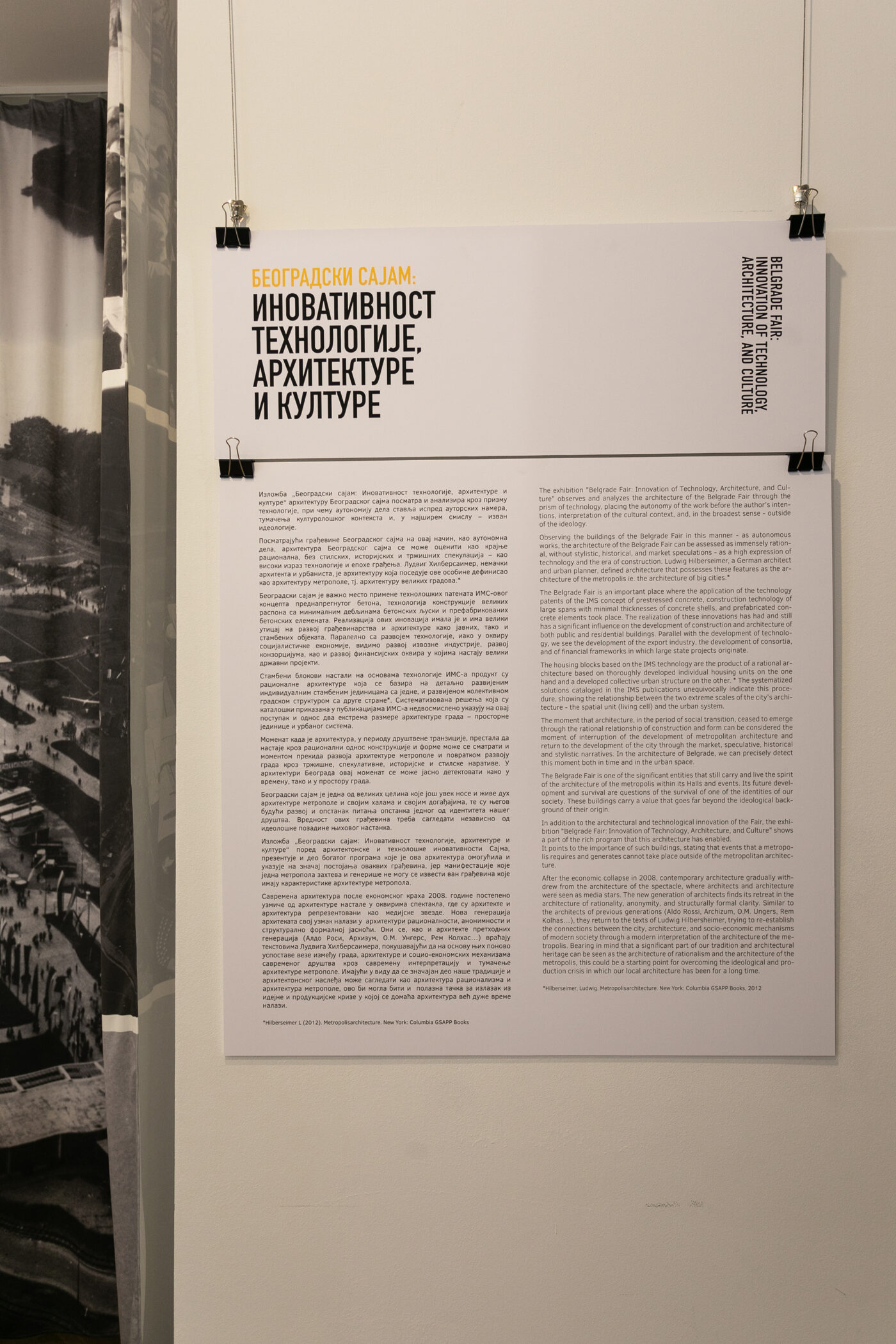Izložba „Beogradski sajam: Inovativnost tehnologije, arhitekture i kulture“ arhitekturu Beogradskog sajma posmatra i analizira kroz prizmu tehnologije, pri čemu autonomiju dela stavlja ispred autorskih namera, tumačenja kulturološkog konteksta i, u najširem smislu – izvan ideologije.